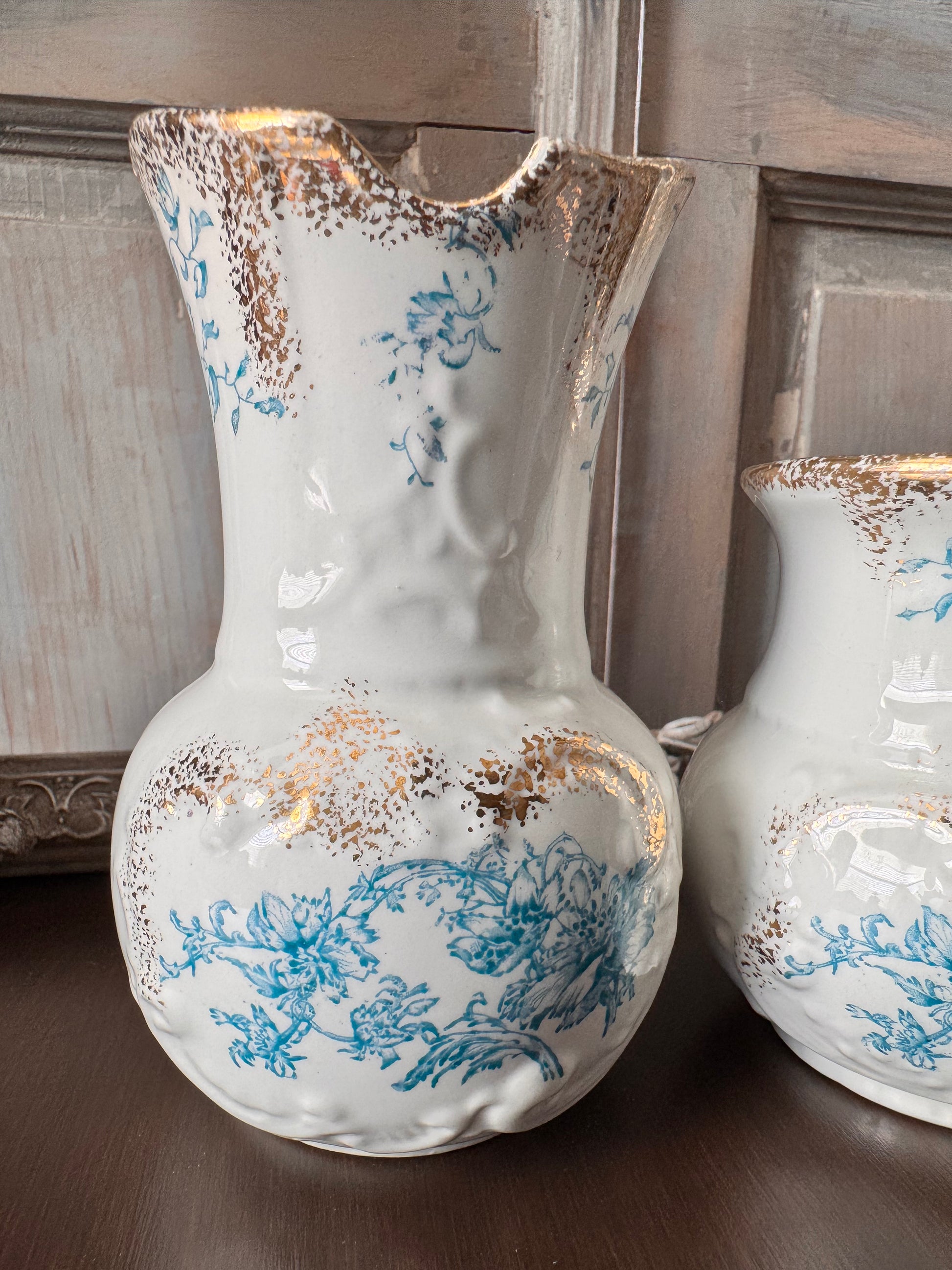 This antique ironstone W.H. Grindley & Co. toothbrush holder and rinse cup (1891-1914) set is in excellent condition with no cracks or chips. The pattern number is 21941l, making it a rare find in this pristine state.