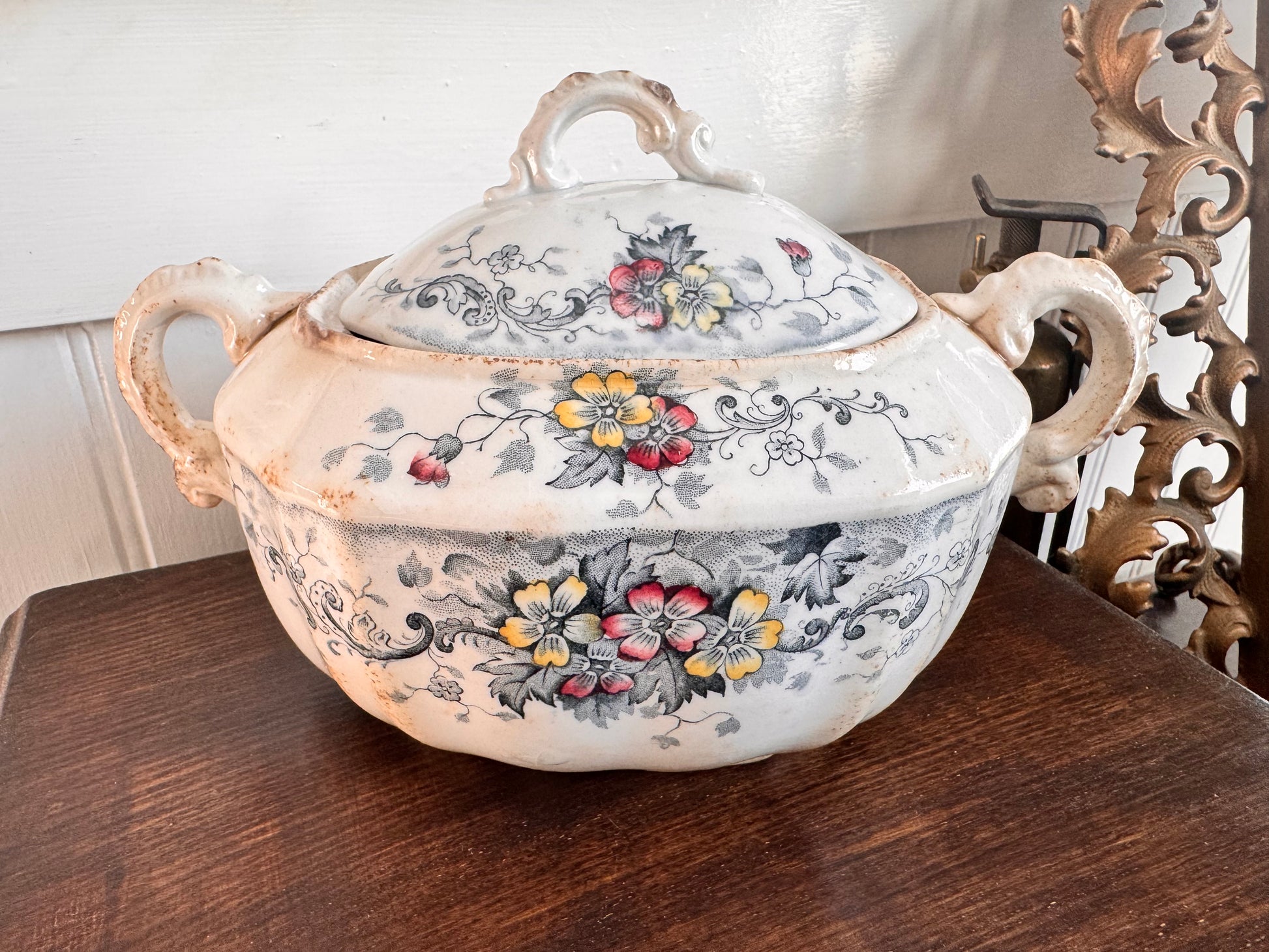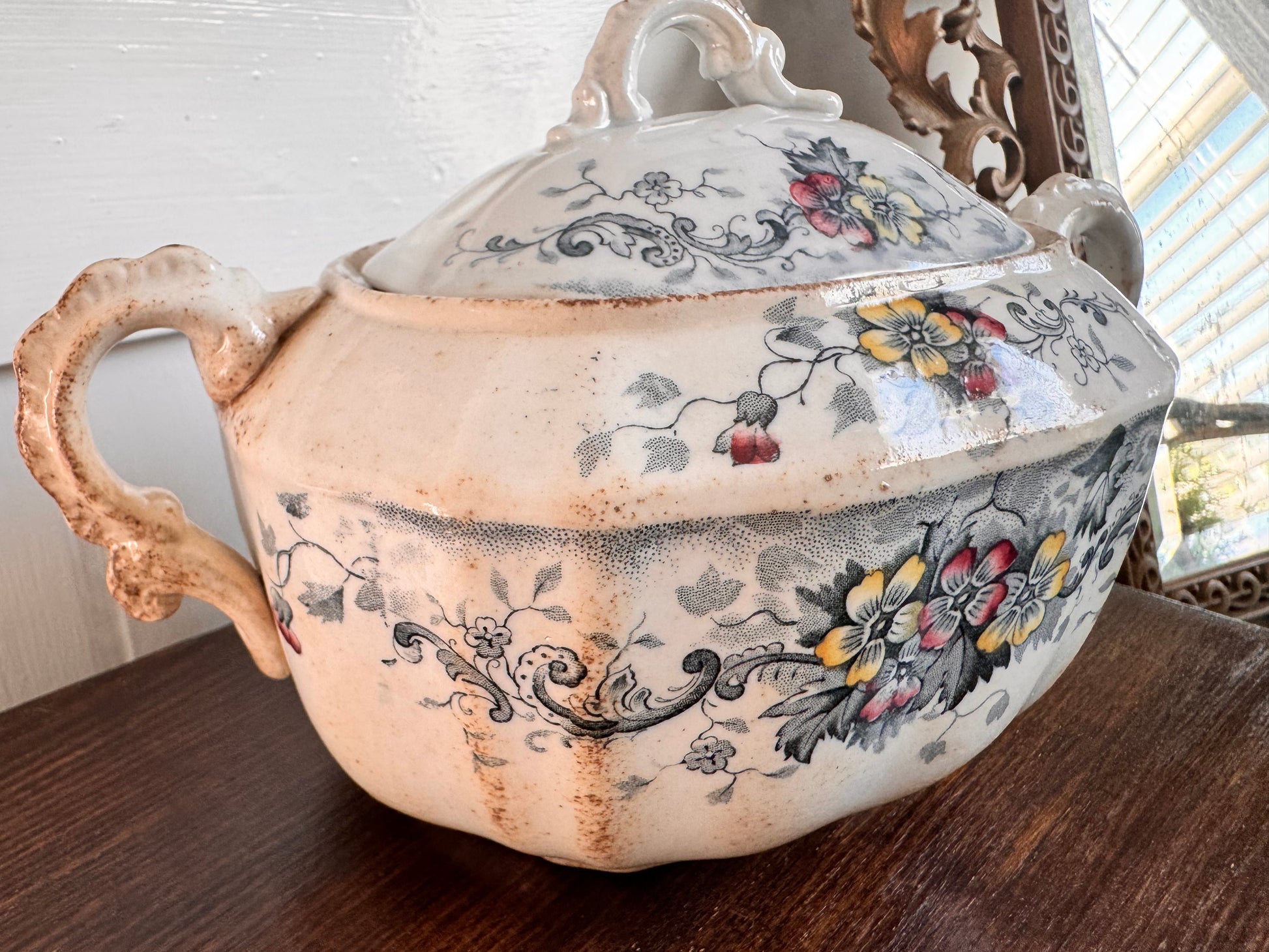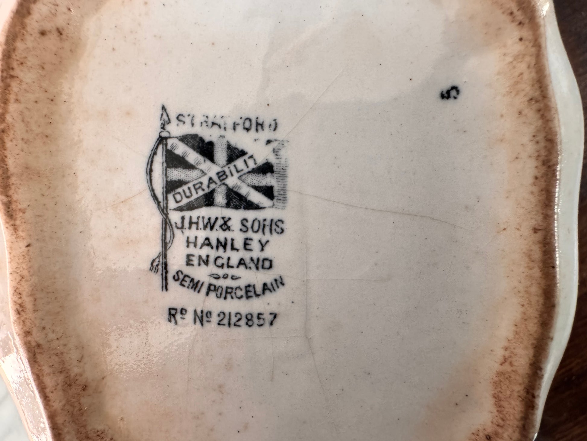 Experience the elegance and history of the JH Weatherby & Sons Sugar Bowl & Creamer Set, featuring a registration number "Ro No 212857" indicating its origins from 1893-1894. This antique set, originally part of a larger tea or breakfast set, displays typical signs of age such as staining and crazing, adding a touch of authenticity and charm. Enhance your home decor with this 4" tall creamer and 5.5" tall sugar bowl, measuring 6" and 8" wide respectively. Take a look at the included pictures for more details.