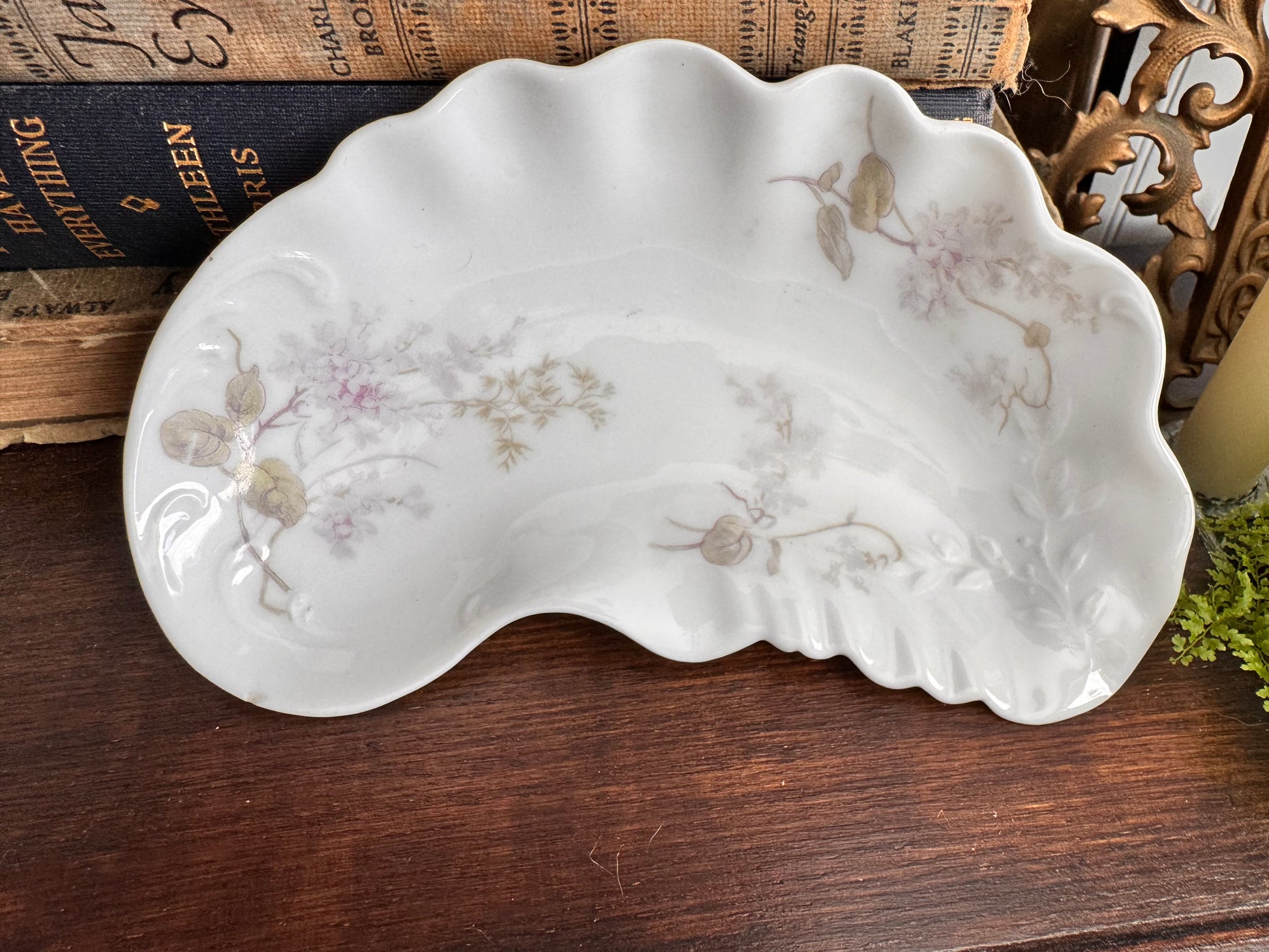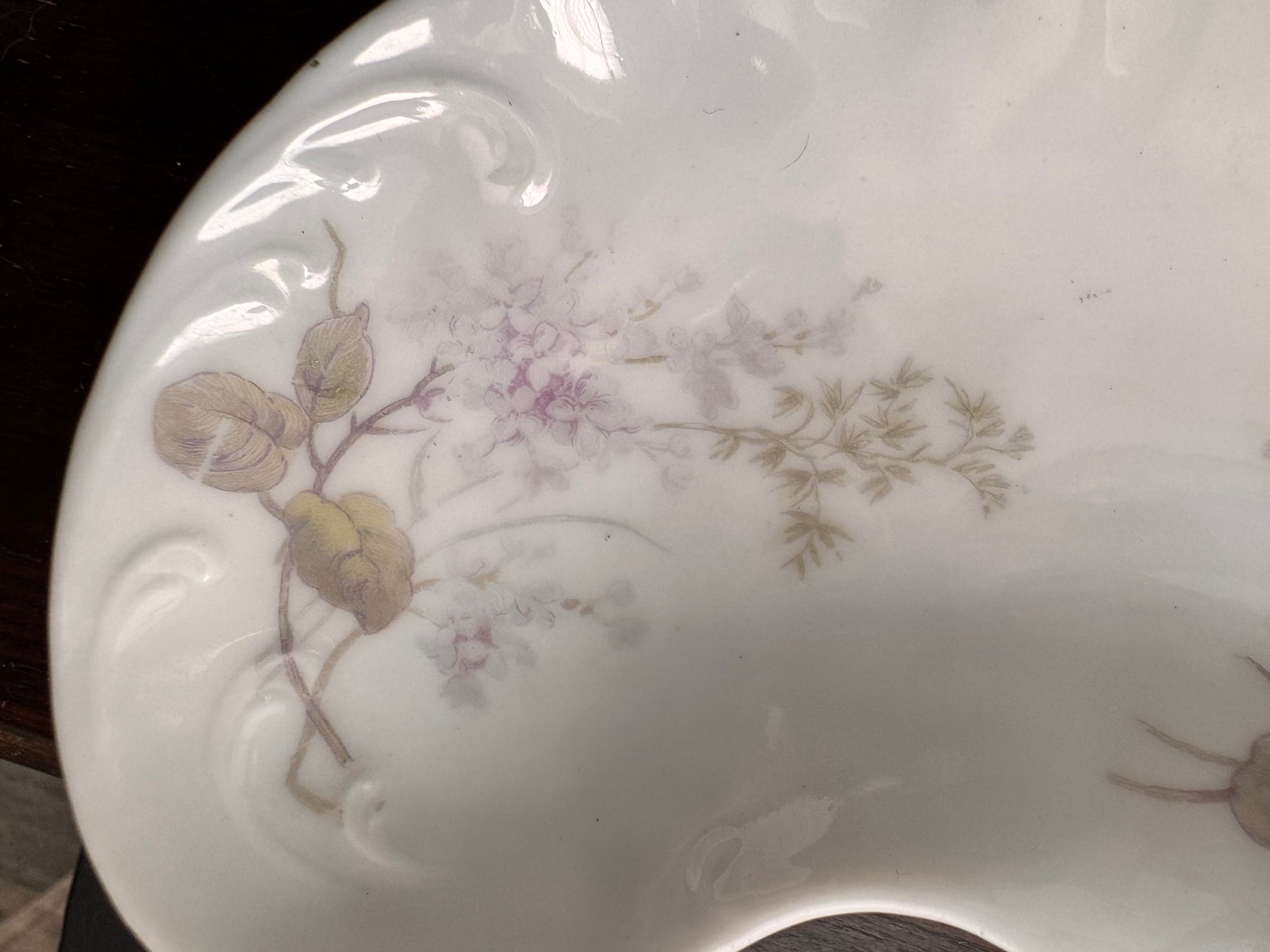 This is a beautiful Limoges bone dish was manufactured A. Lanternier. The company was known for producing high-quality porcelain tableware and decorative items, often featuring delicate floral designs and gilding. Lanternier's pieces were popular among the middle and upper classes, and were often sold in fine department stores and jewelry shops. This dish dates from the late 1800s to early 1900s and would have been part of a larger set of dishes.